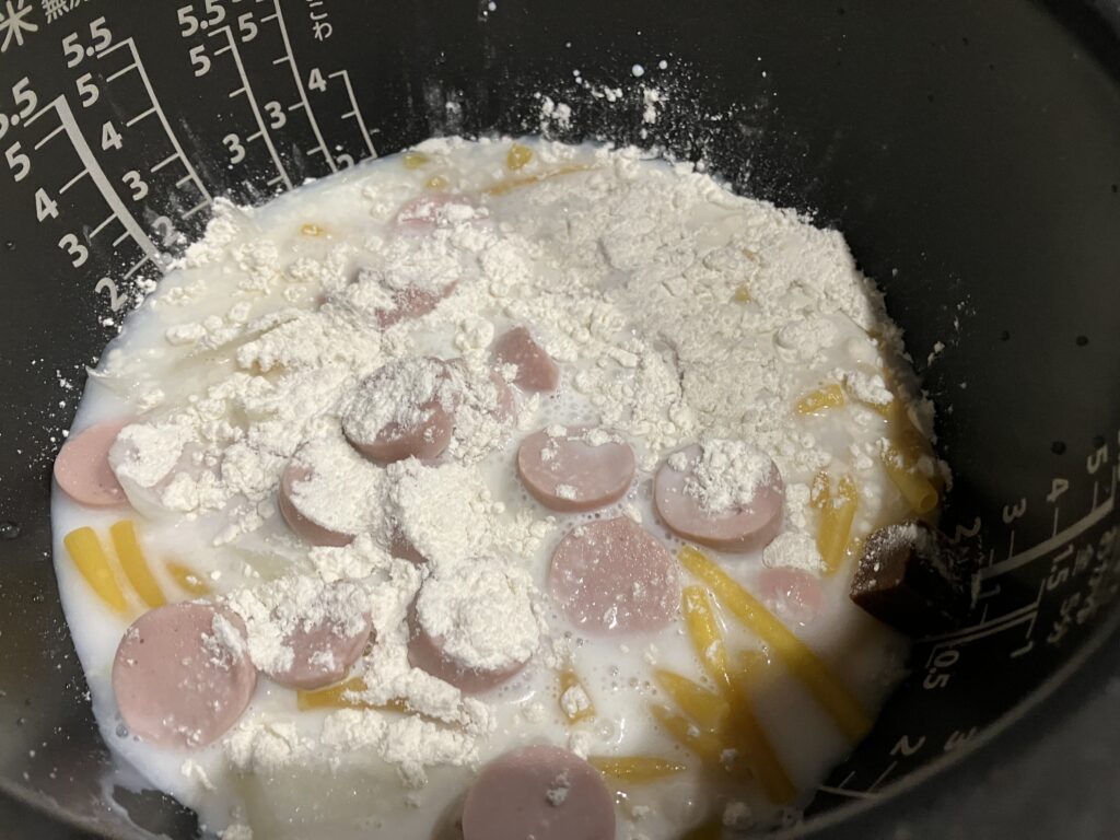 ①炊飯器釜に玉ねぎ、マカロニ、ウインナー、しめじ、★を入れ、薄力粉をふりかける。