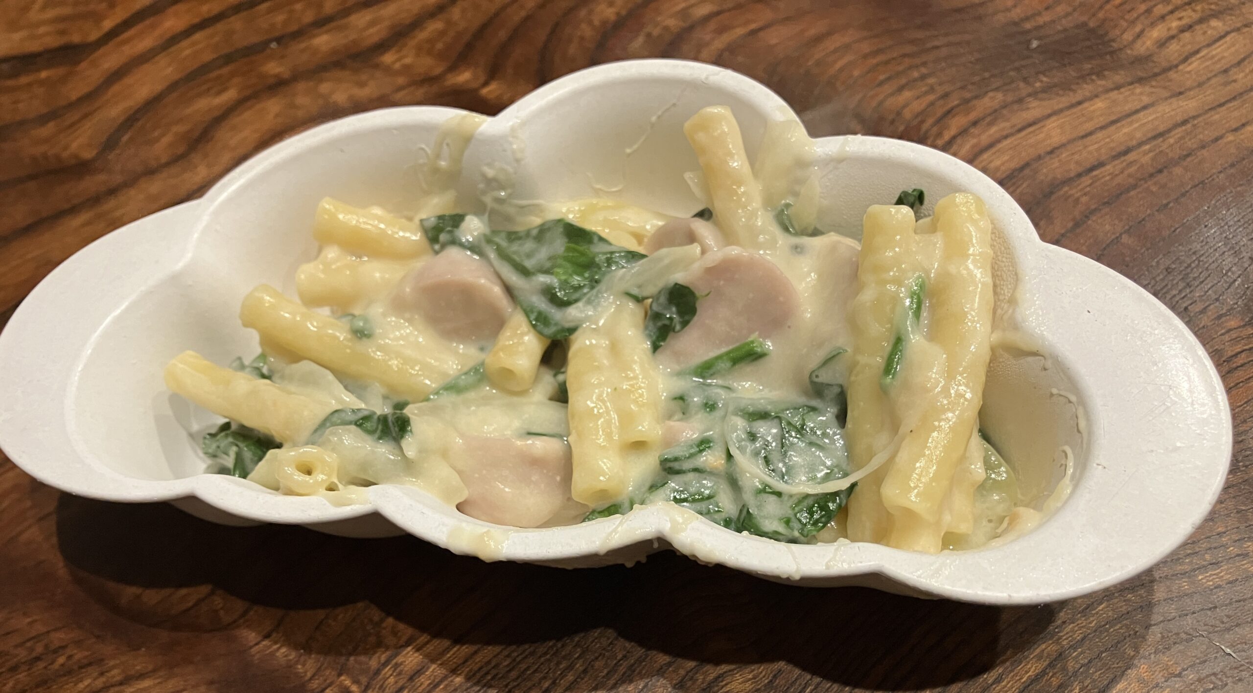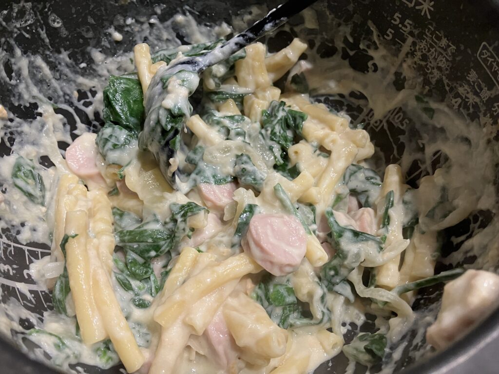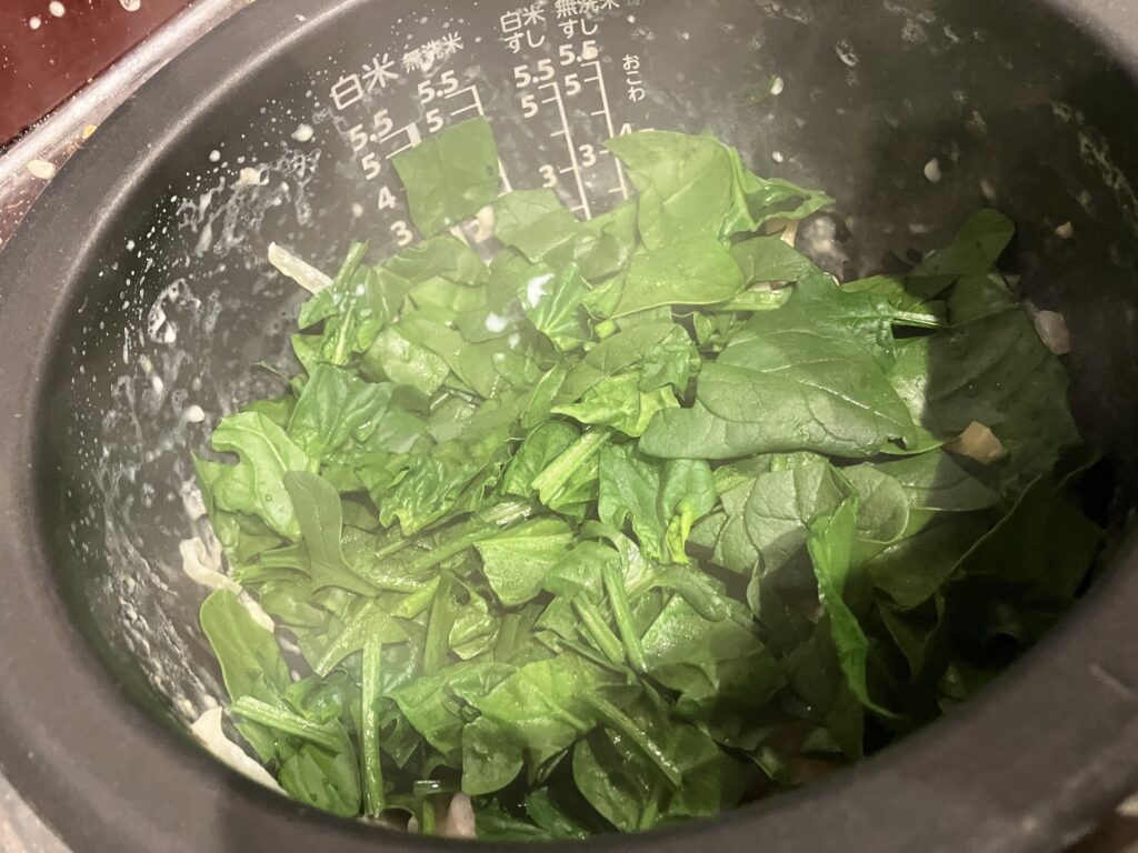 ②ほうれん草、バターを入れて全体を混ぜ、ピザ用チーズをふりかけて蓋をして保温で10分放置する。