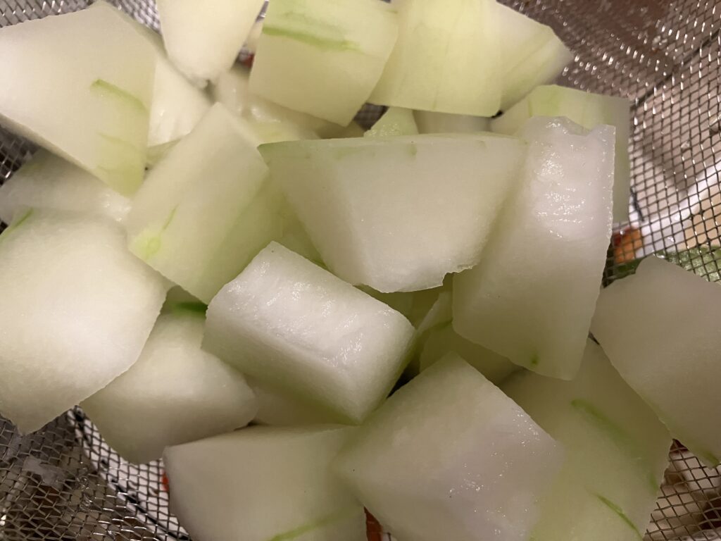 ①鍋にお湯を沸騰させ、冬瓜を1分下茹でする。