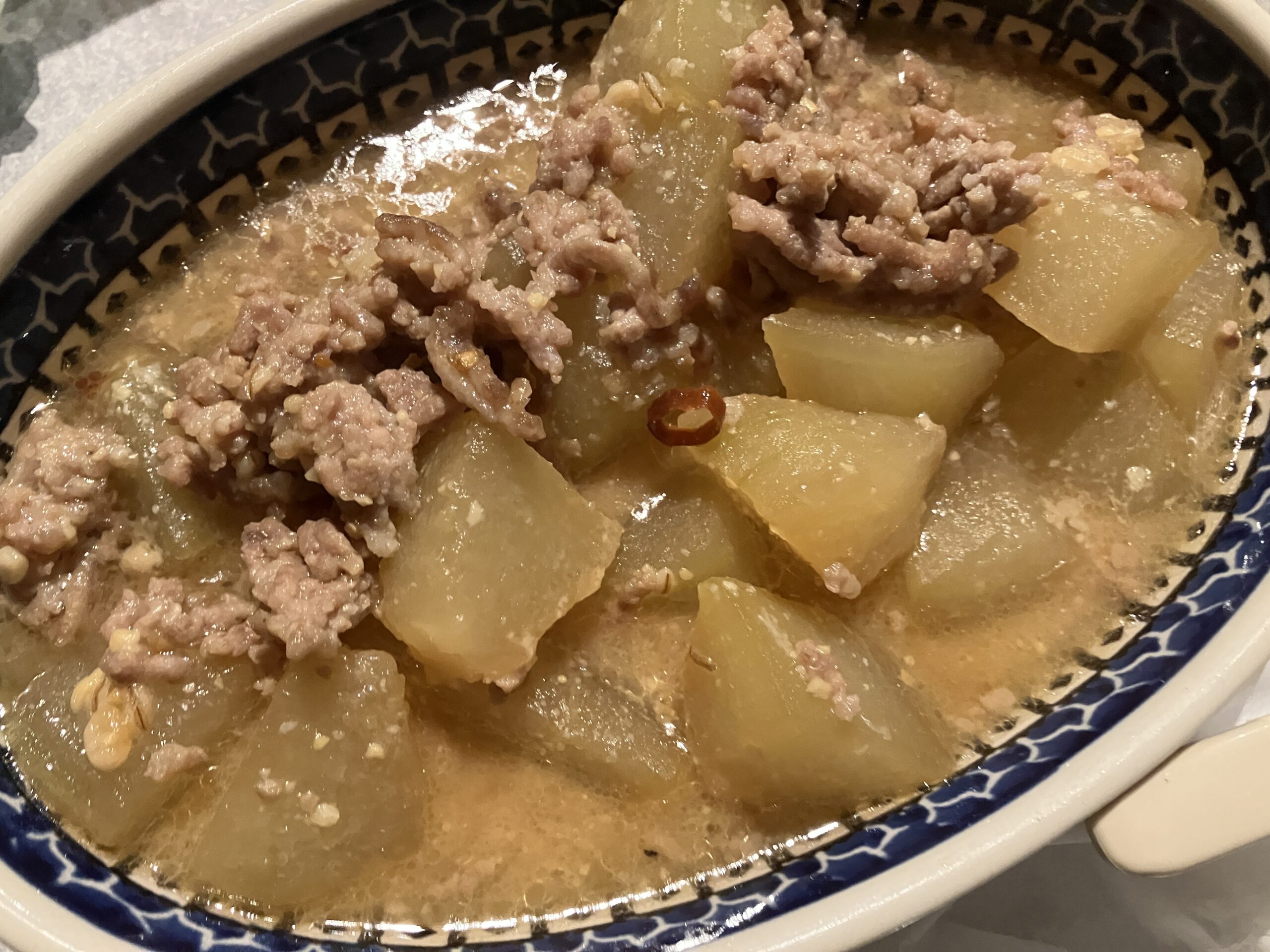 ①鍋にお湯を沸騰させ、冬瓜を1分下茹でする。