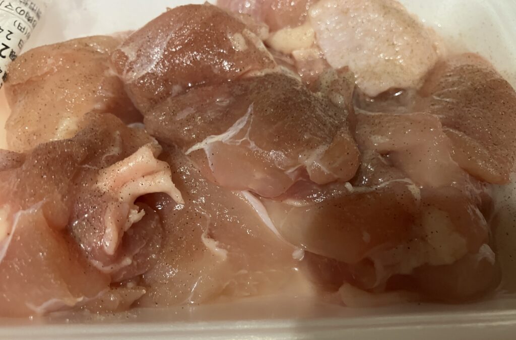 ②肉の水分をさっととり、片栗粉をまぶして少量の油でこんがりするまで揚げる。