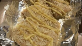 材料白身魚・・・200gくらい(お好みの大きさに切る コストコのパンがシウス1枚使用しています)★パン粉・・・10g★粉チーズ・・・15g★カレー粉・・・小さじ1/2マヨネーズ・・・適量